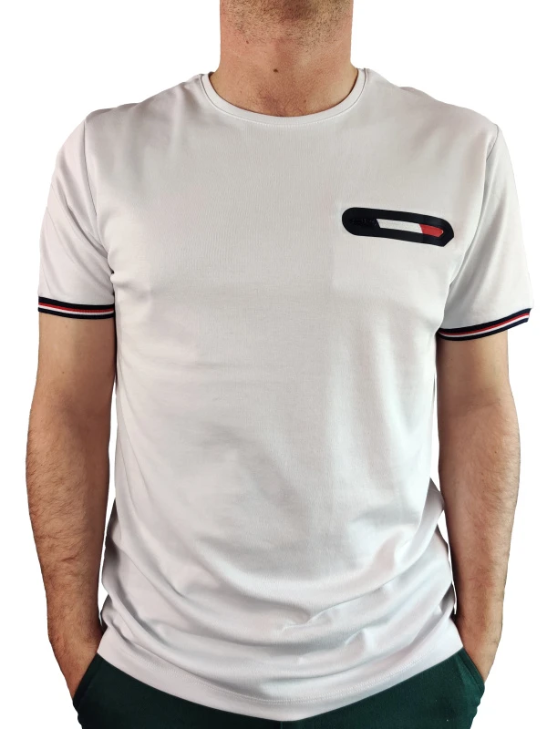 – Une poche zippée à la poitrine aux couleurs : bleu, blanc, rouge